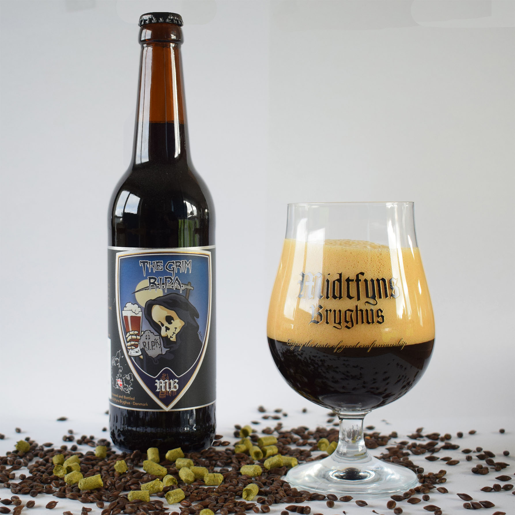 The Grim R.I.P.A is a black rye IPA. A fusion of 2 extreme beer styles, Imperial Stout and Double IPA. The beer is as black as death and frightfully bitter. This beer scares everyone with its evil powers. But those who dare to challenge anything creepy will find The Grim R.I.P.A scary good. Enjoy it with scary good chips or snacks in frightfully good company. Do you dare?